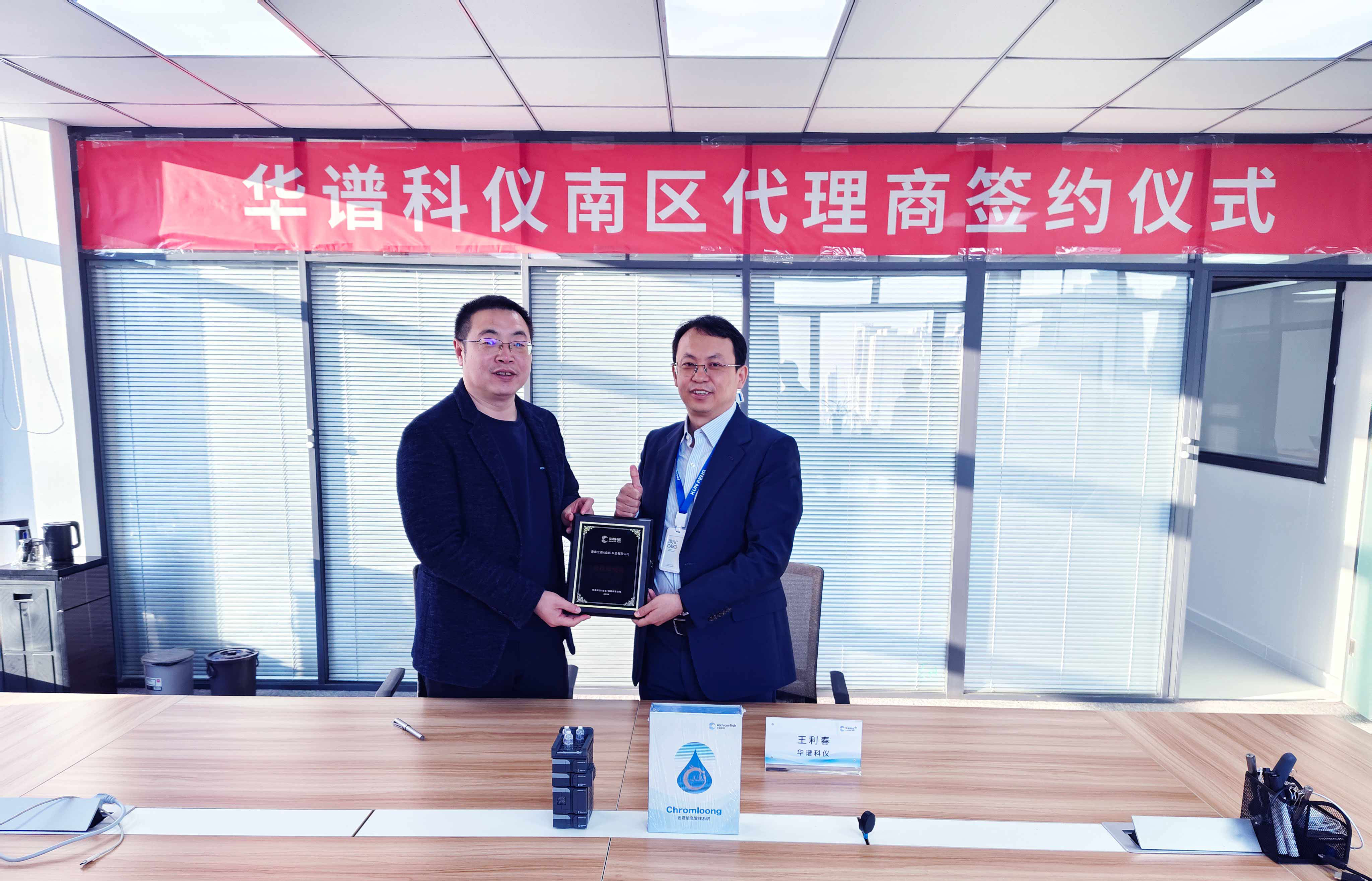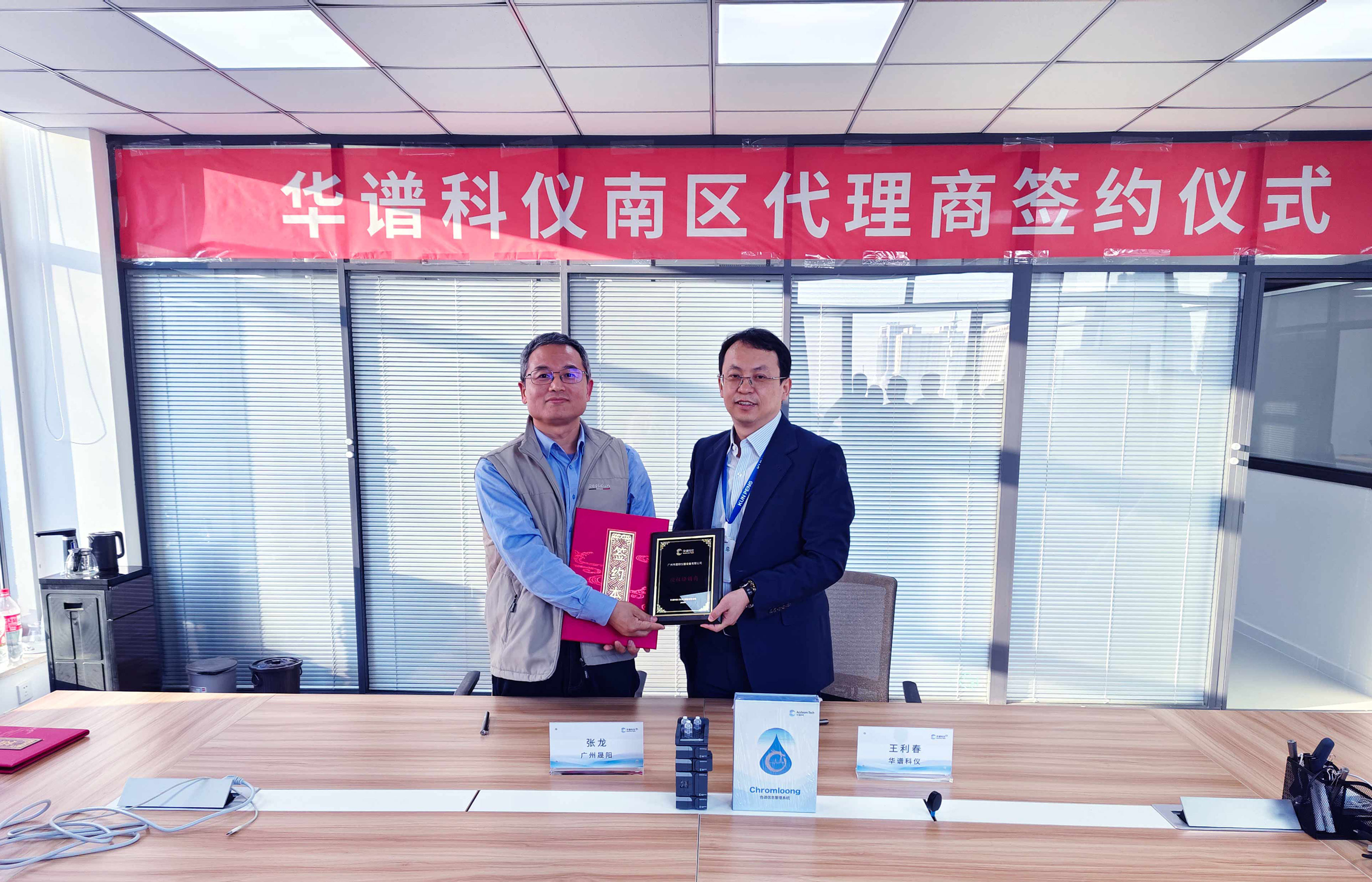 華譜科儀董事長王利春(右)與晟陽儀器代表張龍(左)合影