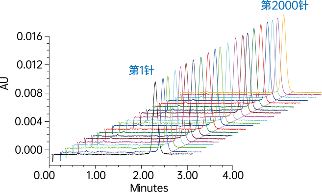 Alphasil VC-C18色譜柱采用高純硅膠和鍵合工藝,鍵合相不易流失,具有較好的穩定性。在酸性條件下,通過連續進樣測試棓丙酯的保留時間、峰形和柱效,結果顯示,即使進樣2000針后,色譜柱的性能仍然保持良好。