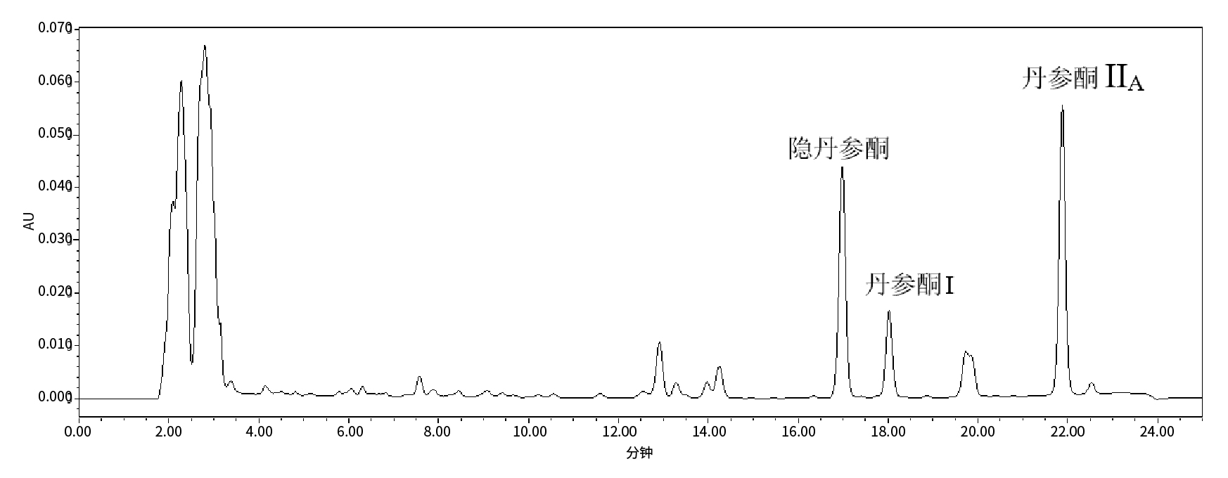 本文參照2020版《中國藥典》,采用全多孔色譜柱Alphasil VC-C18,對丹參供試品進行分析,結果顯示,丹參中目標峰峰形良好,隱丹參酮、丹參酮I的相對保留時間分別為0.78和0.82,丹參酮ⅡA峰目標峰理論塔板數大于60000,符合《中國藥典》要求。本方案可為丹參中丹參酮類的測定提供參考。