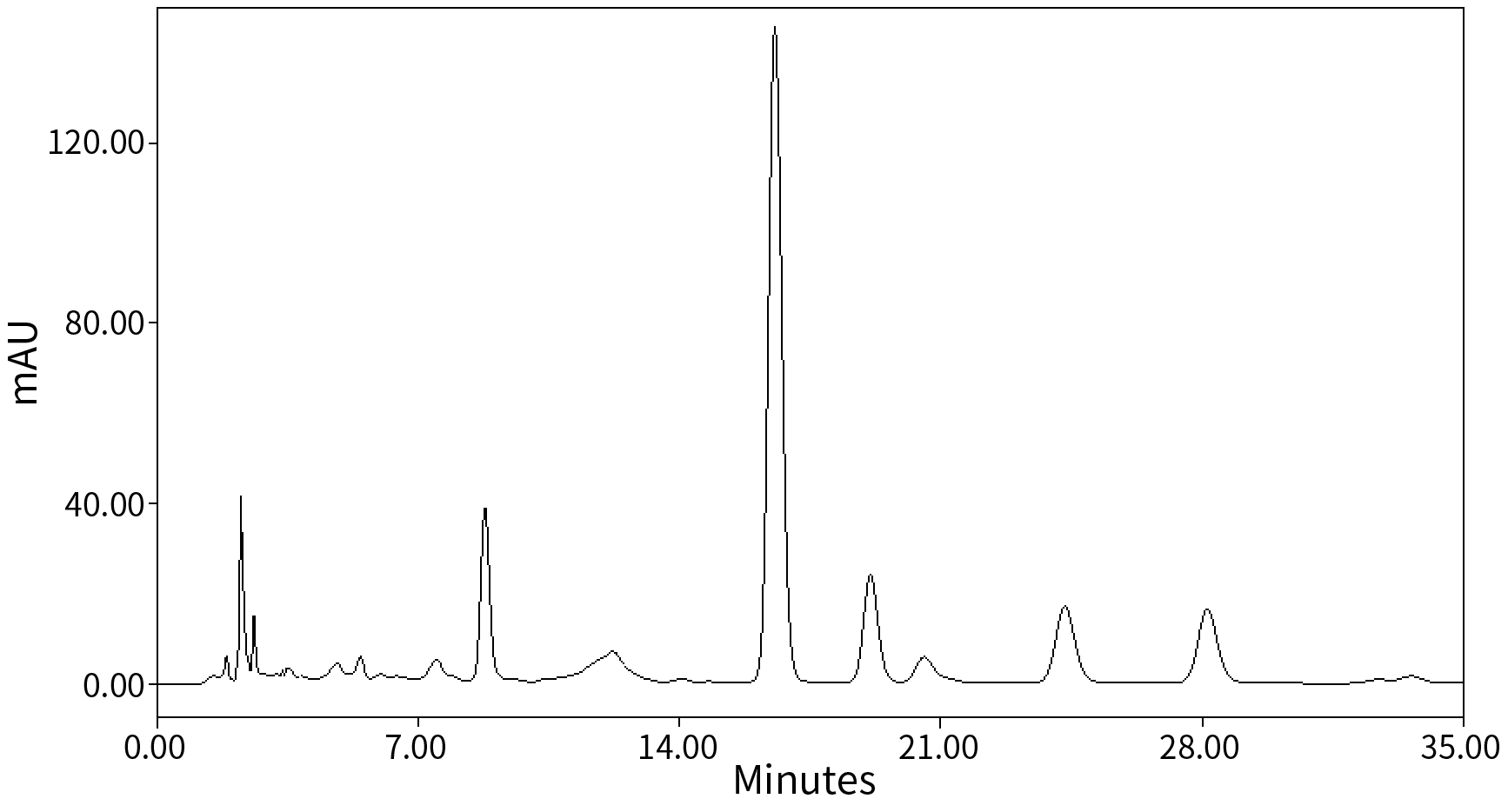 摘要:本文參照2020版《中國(guó)藥典》,采用全多孔色譜柱Alphasil VC-C18,對(duì)葛根供試品進(jìn)行分析,結(jié)果顯示,葛根中目標(biāo)峰峰形良好,葛根素目標(biāo)峰理論塔板數(shù)大于4000,符合《中國(guó)藥典》要求。本方案可為葛根中葛根素的測(cè)定提供參考。