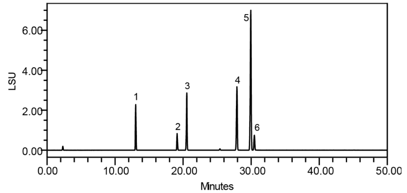 華譜科儀針對該項調整,特別推出了 Alphasil ACCHROM Xaqua C18牛黃專用柱,該色譜柱在色譜分析的關鍵性能指標上展現出良好的實力。華譜科儀的液相色譜儀器與色譜柱組合,可以全面滿足該類應用的分析需求