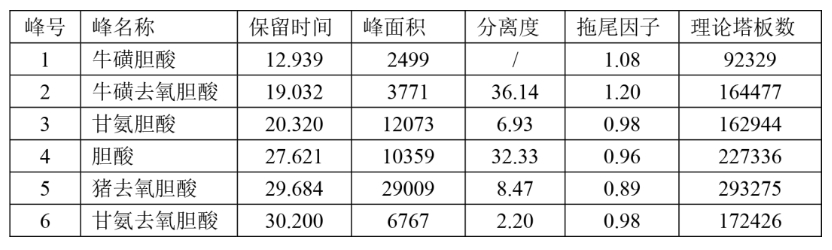 · 理論塔板數高于10000(以牛磺膽酸峰計),符合要求。