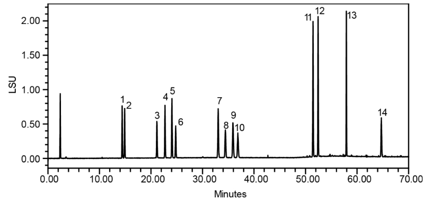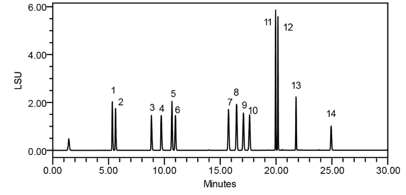Alphasil ACCHROM Xaqua C18牛黃專用柱不僅可以達到公示稿中含量測定要求,通過優化標準方法,也可以用于藥材的鑒別,能夠同時分離14種膽酸類化合物,并展現出良好的分離選擇性、理想的峰形和分離度。