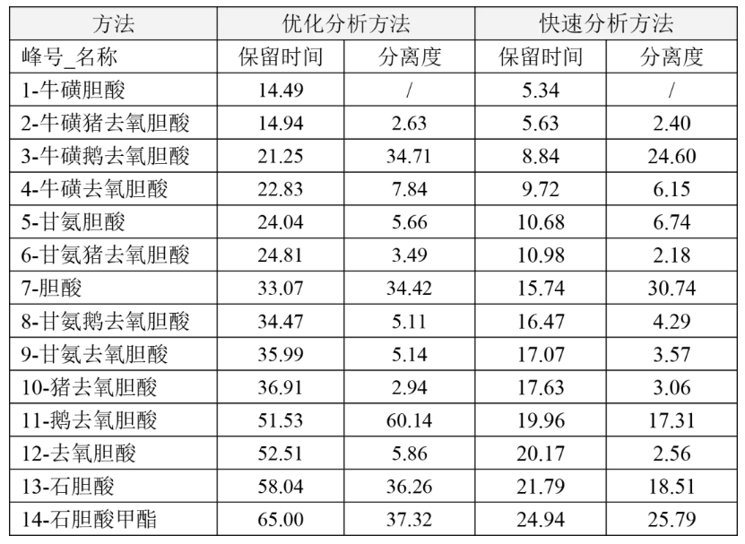 當更關注分析效率時,3.5μm的Alphasil ACCHROM Xaqua C18牛黃專用柱可將14種膽酸類化合物的分析時間縮短60%,同時能保證各組分之間的分離度,大大提高了樣品的分析通量。