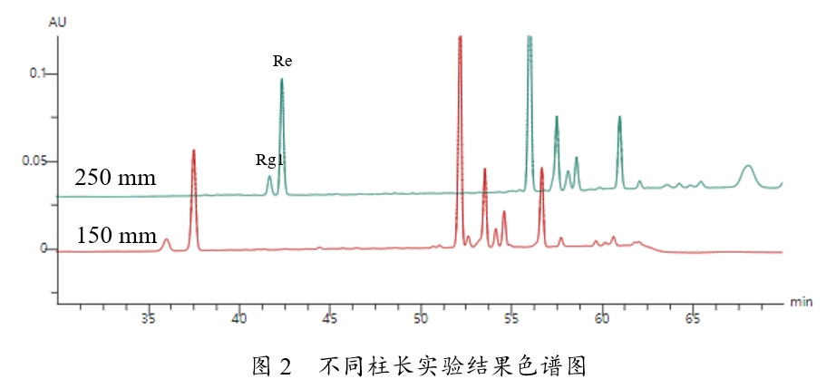 本文對(duì)色譜柱長(zhǎng)度進(jìn)行了考察,結(jié)果發(fā)現(xiàn)了一個(gè)有趣的現(xiàn)象,150mm色譜柱Rg1和Re分離效果優(yōu)于250mm的色譜柱,如圖2所示。這個(gè)結(jié)果與我們過往經(jīng)驗(yàn)相悖,即相同條件下,色譜柱越長(zhǎng),化合物分離度應(yīng)該越好。