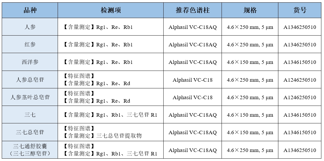 為了方便大家選擇合適的色譜柱,我們將藥典中人參皂苷的品種和對(duì)應(yīng)的色譜柱匯總?cè)缦隆?/span>