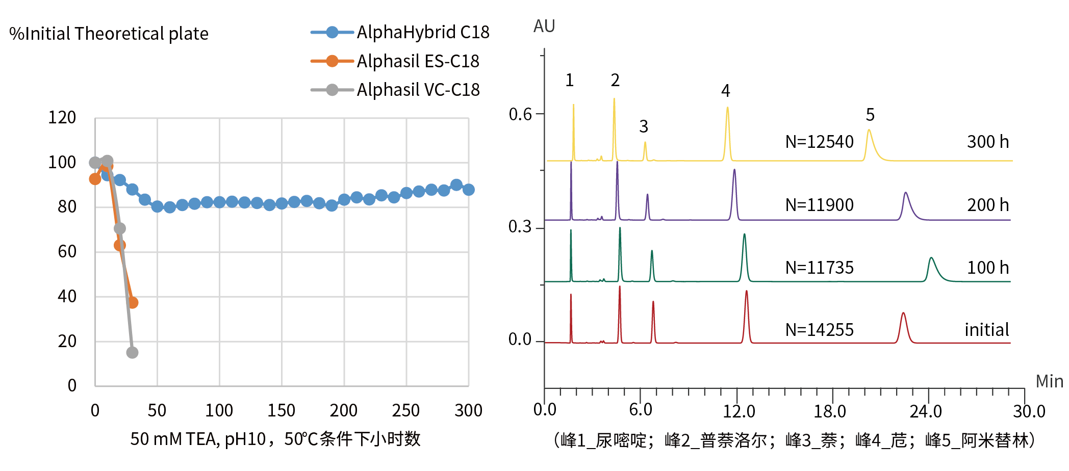 對AlphaHybrid C18耐堿性進行考察,AlphaHybrid C18在50 mM的三乙胺(pH=10)、柱溫50℃的條件下共經過300 h,柱效依然保持在80%以上。