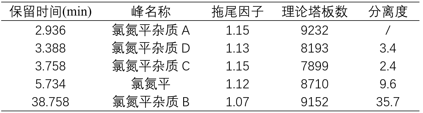 本實驗參照2020版《中國藥典》氯氮平有關物質的液相分析方法,采用AlphaHybrid C18, 4.6×150 mm, 5 μm色譜柱對氯氮平及四種氯氮平雜質進行分離分析,分離性能良好。