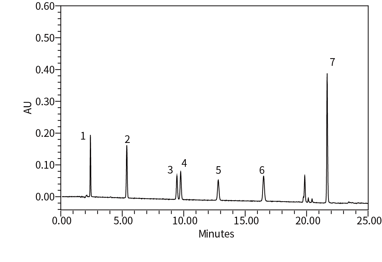 采用AlphaHybrid C18,4.6×150 mm,5 μm色譜柱,對包括索他洛爾、阿替洛爾、拉貝洛爾、吲哚洛爾、美托洛爾、比索洛爾、普萘洛爾在內的7種β受體阻斷劑進行分離測試,實現了良好分離。