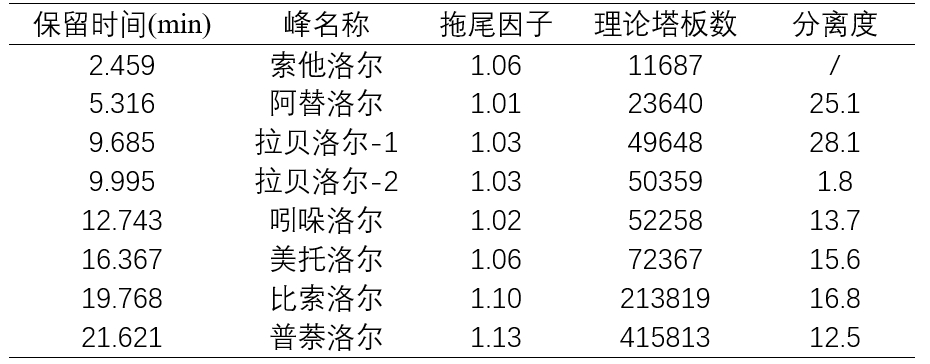 峰1_索他洛爾;峰2_阿替洛爾;峰3_拉貝洛爾(非對映異構對);峰4_吲哚洛爾;峰5_美托洛爾;峰6_比索洛爾;峰7_普萘洛爾;)