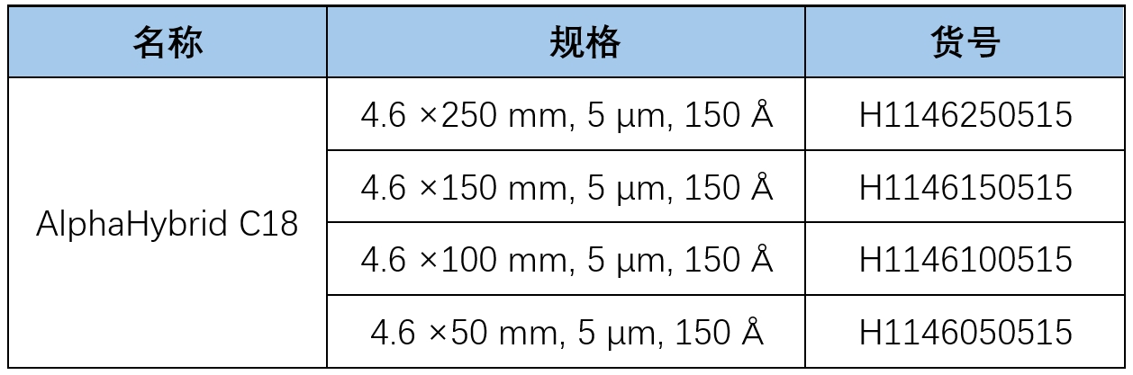 華譜科儀研發團隊以最新研發的雜化顆粒為載體,結合特有的鍵合技術和表面修飾,隆重推出AlphaHybrid C18產品。該產品將pH耐受范圍拓寬至12,突破了反相色譜柱在高pH條件下的應用限制,為方法開發、分析檢測帶來新的選擇!
