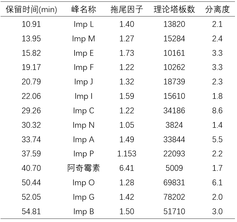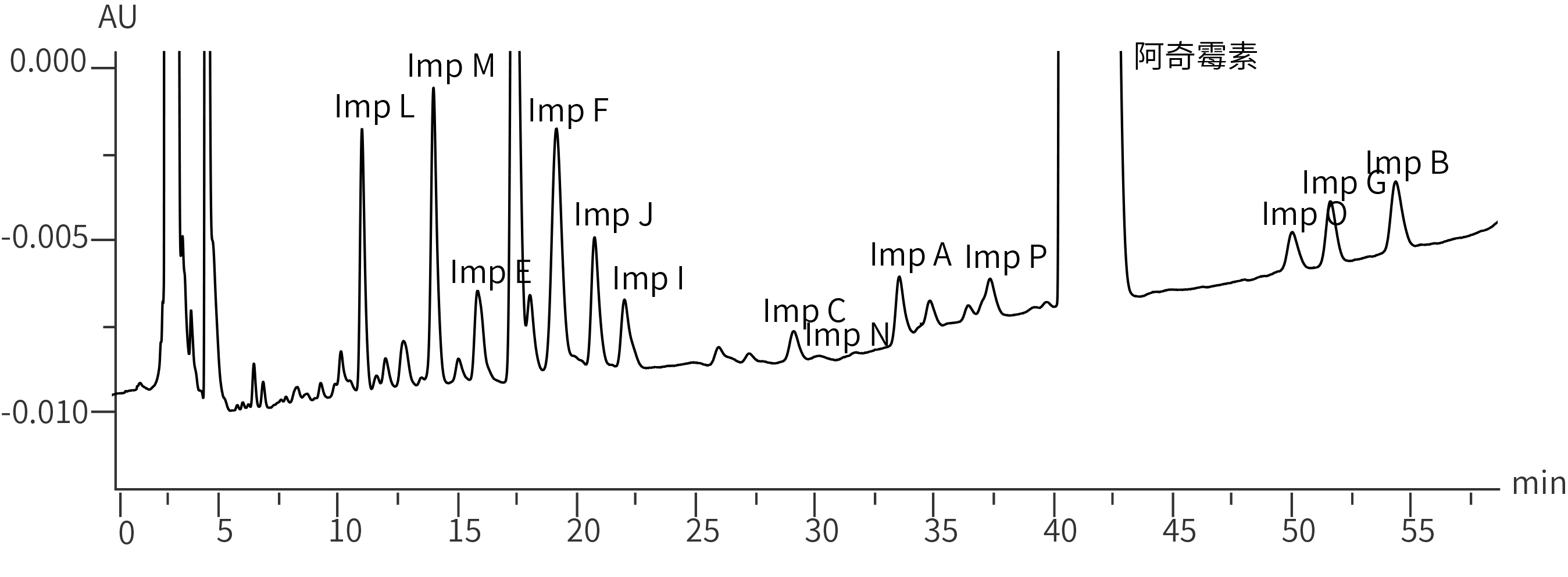 本實驗參照歐洲藥典(EP)方法,采用 AlphaHybrid C18, 4.6×250 mm, 5 μm色譜柱對阿奇霉素有關物質項下系統適用性及峰鑒別溶液進行分離,實現阿奇霉素和13種雜質的良好分離。