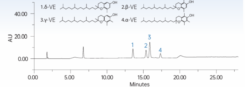 如下圖所示,使用Alphasil S-PFP進行4種維生素E異構體檢測也可以獲得良好的分離。