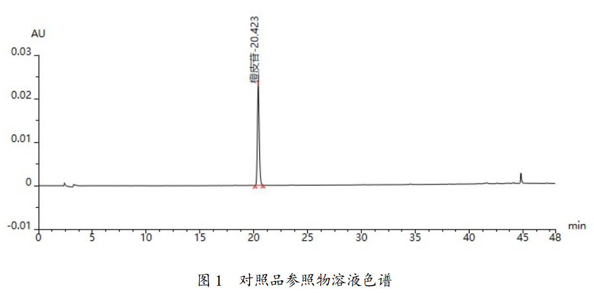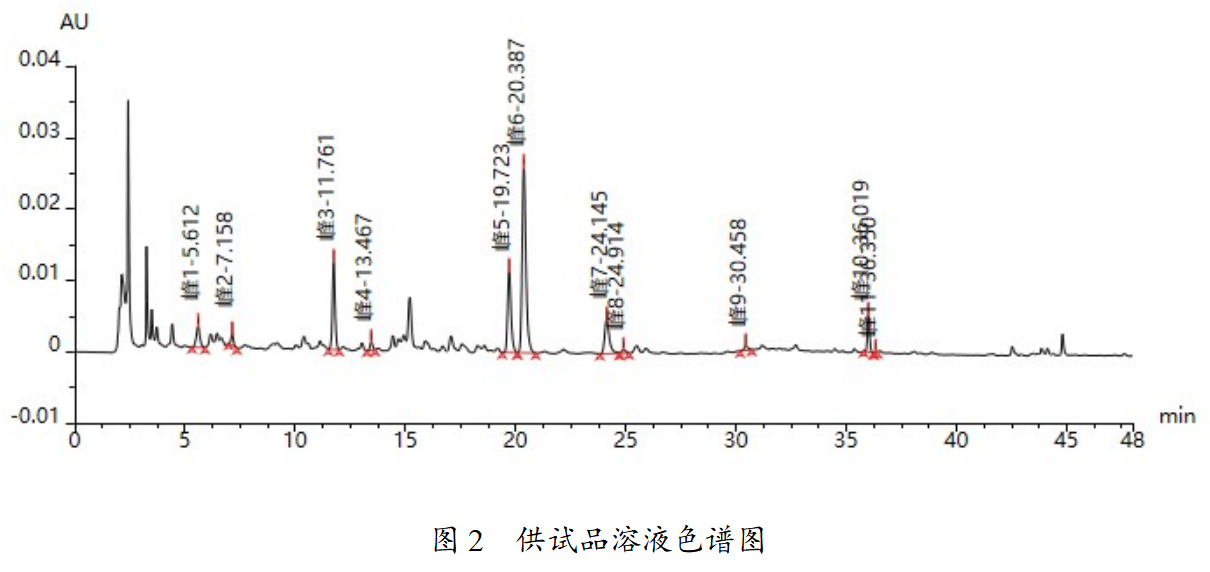 對參照物溶液及供試品溶液進行檢測,結果如下圖及表所示,根據結果可知,理論板數按橙皮苷峰計算為69052,滿足藥典理論板數按橙皮苷峰計算應不低于5000的要求,供試品色譜中呈現11個特征峰,各峰相對保留時間均可滿足藥典要求。
