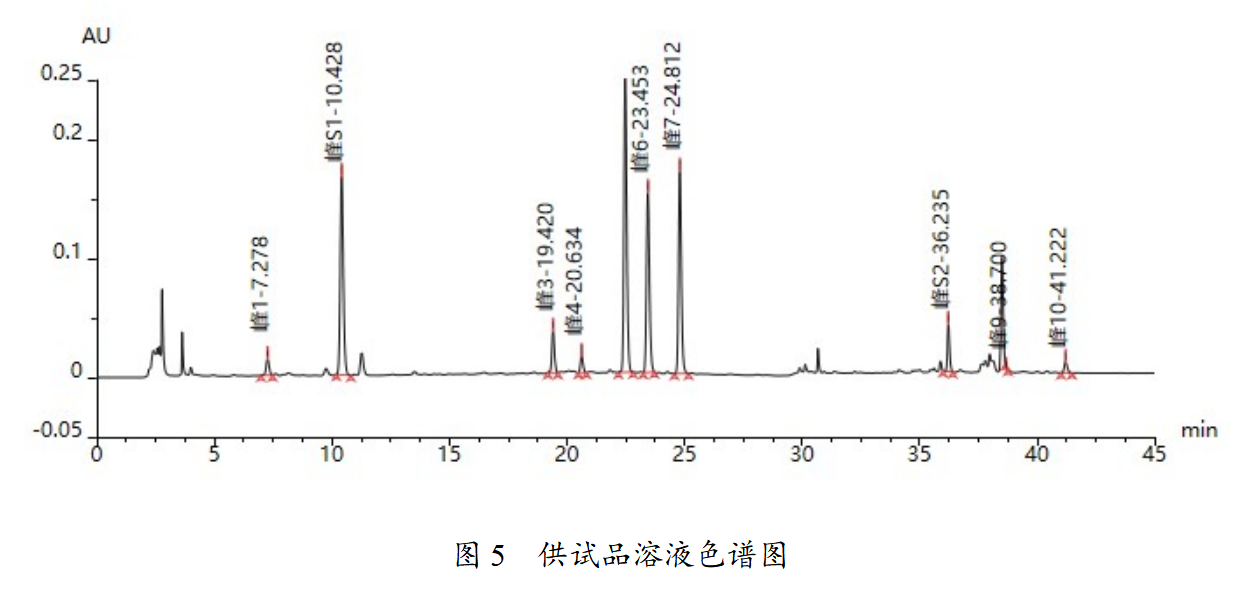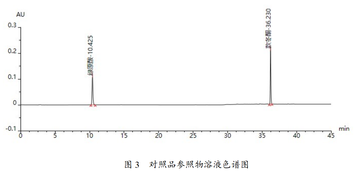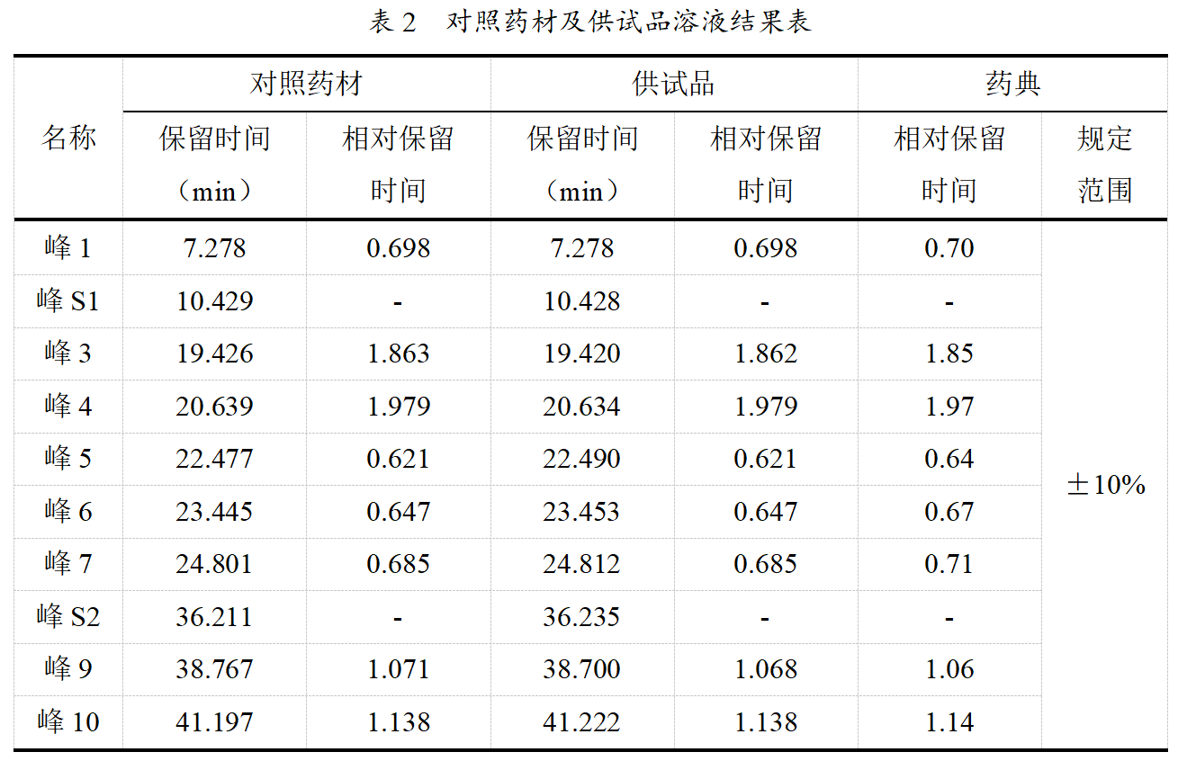 對參照物溶液及供試品溶液進行檢測,結果如下圖及表所示,根據結果可知,理論板數按綠原酸峰計算為30691,滿足藥典理論板數理論板數按綠原酸峰計算應不低于6000的要求,供試品色譜中呈現10個特征峰,各峰相對保留時間均可滿足藥典要求。