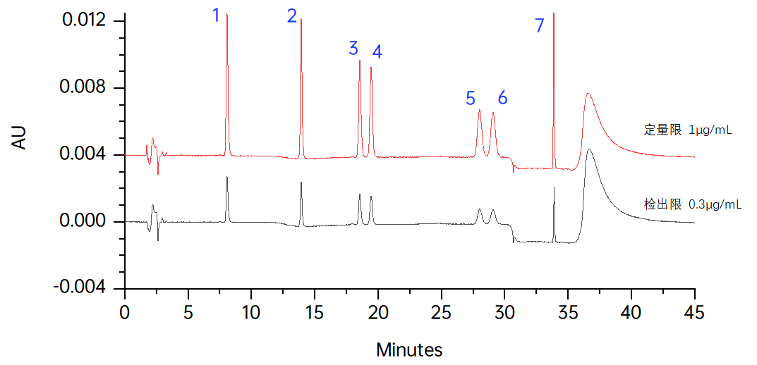 圖1  檢出限定量限色譜圖